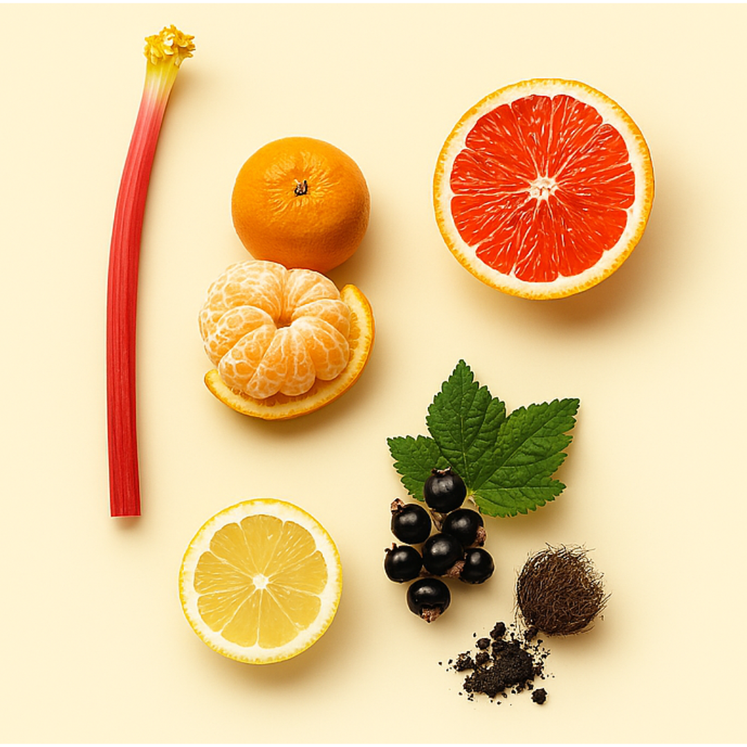 Toronja, Yuzu, Cassis, Bergamota, Mandarina, Fresia, Ruibarbo, Almizcle